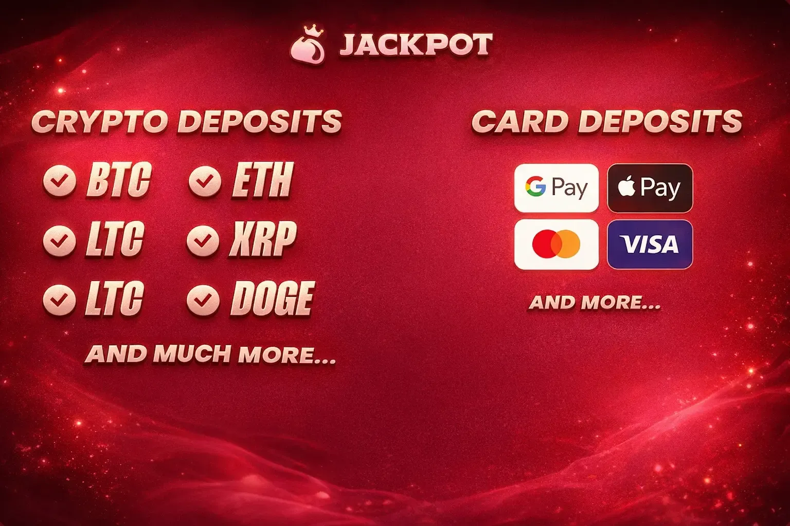 | Crypto Deposit | Jackpot Wallet | BTC, ETH, USDT, USDC, DOGE, TRX, LTC, SOL, BNB, XRP and more | ~1–5 minutes |