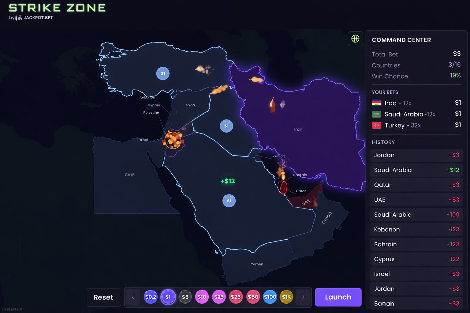 Each round takes place on a live map of the Middle East. Iran serves as the launch point and sixteen surrounding countries are your targets, each one with a published hit chance and a multiplier attached to it.